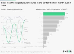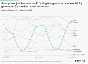 Για πρώτη φορά στην ιστορία, τον Ιούνιο του 2025, η ηλιακή ενέργεια αναδείχθηκε η κυρίαρχη πηγή ηλεκτρισμού στην Ε.Ε., ξεπερνώντας τόσο την πυρηνική ενέργεια όσο και την αιολική. Το επίτευγμα αυτό, που αναλύεται λεπτομερώς στην πρόσφατη έκθεση του Ember Energy (δημοσιεύτηκε στις 10 Ιουλίου 2025), υπογραμμίζει την ταχεία πορεία της Ευρώπης προς την απανθρακοποίηση και την ενίσχυση της ενεργειακής της αυτονομίας.