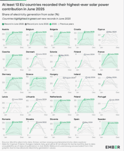 Σύμφωνα με τα στοιχεία, τον Ιούνιο του 2025, η ηλιακή ενέργεια κάλυψε το 22,1% (45,4 TWh) της συνολικής παραγωγής ηλεκτρισμού στην Ε.Ε., υπερβαίνοντας οριακά την πυρηνική ενέργεια, η οποία κατέλαβε τη δεύτερη θέση με 21,8% (44,7 TWh). Η αιολική ενέργεια ακολούθησε με 15,8% (32,4 TWh). Αυτή η επίδοση της ηλιακής ενέργειας αποτελεί μια εντυπωσιακή αύξηση της τάξης του 22% σε σχέση με τον Ιούνιο του 2024. Η δυναμική αυτή αποδίδεται τόσο στις συνεχείς νέες εγκαταστάσεις φωτοβολταϊκών συστημάτων όσο και στις ευνοϊκές καιρικές συνθήκες, που επέτρεψαν στο ευρωπαϊκό ενεργειακό σύστημα να ανταποκριθεί στην αυξημένη ζήτηση κατά τη διάρκεια των καύσωνα. Είναι χαρακτηριστικό ότι τουλάχιστον δεκατρείς χώρες της Ε.Ε., συμπεριλαμβανομένης της Γερμανίας, της Γαλλίας και της Ισπανίας, κατέγραψαν νέα μηνιαία ρεκόρ στην ηλιακή παραγωγή τον Ιούνιο του 2025.