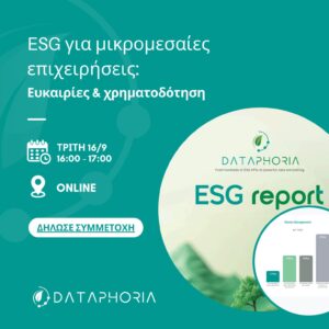 Το επόμενο online masterclass της εταιρείας Dataphoria έρχεται να αποδείξει ακριβώς το αντίθετο: ότι η υιοθέτηση των κριτηρίων Περιβάλλοντος, Κοινωνίας και Εταιρικής Διακυβέρνησης δεν είναι απλώς ένα κόστος, αλλά μια ευκαιρία για χρηματοδότηση, νέες συνεργασίες και ενίσχυση της αξιοπιστίας.