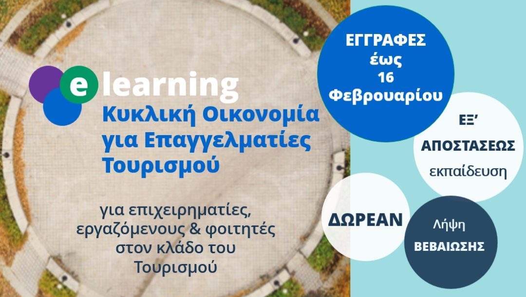 Στο πλαίσιο αυτό, το εμβληματικό έργο LIFE-IP CEI-Greece («Εφαρμογή της Κυκλικής Οικονομίας στην Ελλάδα»), υπό τον συντονισμό του Υπουργείου Περιβάλλοντος και Ενέργειας, ανακοινώνει ένα ολοκληρωμένο, δωρεάν πρόγραμμα e-learning με τίτλο: «Κυκλική Οικονομία για Επαγγελματίες Τουρισμού».