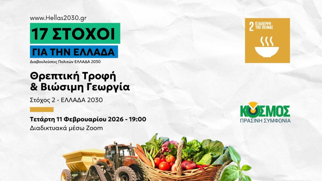 Ο ΚΟΣΜΟΣ Πράσινη Συμφωνία -στο πλαίσιο της δημόσιας διαβούλευσης του πολιτικού προγράμματος ΕΛΛΑΔΑ 2030– διοργανώνει διαδικτυακό διάλογο με θέμα τον Εθνικό Στόχο 2 για την Τροφή & Γεωργία,