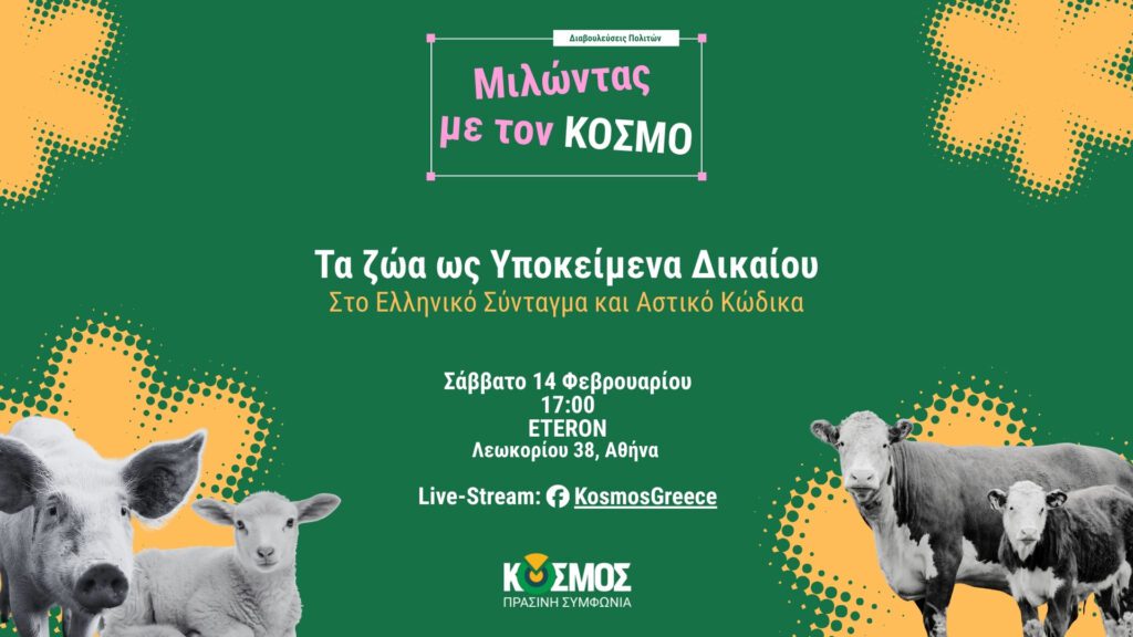 Σε μια κατάμεστη αίθουσα στο ETERON, στην καρδιά της Αθήνας, το Σάββατο 14 Φεβρουαρίου 2026, γράφτηκε μια από τις πιο κρίσιμες σελίδες στην ιστορία του φιλοζωικού κινήματος και της νομικής επιστήμης στην Ελλάδα. Η δημόσια διαβούλευση που διοργάνωσε ο ΚΟΣΜΟΣ – Πράσινη Συμφωνία, με θέμα «Τα Ζώα ως Υποκείμενα Δικαίου στο Σύνταγμα και τον Αστικό Κώδικα», δεν ήταν απλώς μια πολιτική εκδήλωση, ήταν μια κραυγή προόδου απέναντι σε ένα παρωχημένο δίκαιο που εξακολουθεί να αντιμετωπίζει τις συναισθανόμενες υπάρξεις ως «πράγματα».