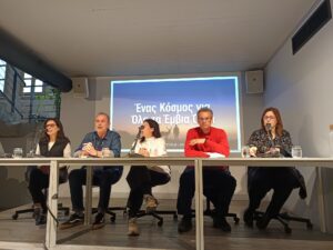 Η εκδήλωση άνοιξε με την εισήγηση της Ειρήνης Σκουζού, συντονίστριας του Τομέα Ελευθερίας, Θεσμών και Δικαιωμάτων του ΚΟΣΜΟΥ.