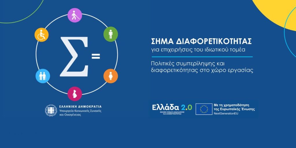 Το «Σήμα Διαφορετικότητας» αποτελεί την πρώτη οργανωμένη κρατική πρωτοβουλία αναγνώρισης επιχειρήσεων που εφαρμόζουν πολιτικές ίσων ευκαιριών και συμβάλλουν ενεργά στην πρόληψη και καταπολέμηση των διακρίσεων στο εργασιακό περιβάλλον.